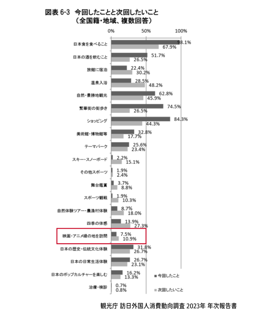 2023年に観光庁が行った訪日外国人消費動向調査によると、2023年に訪れた外国人のうち7.5%(約187万人※)が「映画・アニメゆかりの地を訪問」しています。さらに、10.9%が次回訪日時に聖地巡礼を希望しており、今後も外国人観光客の増加が期待されます。
