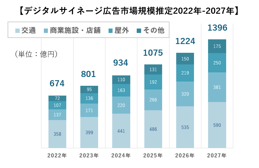 日本国内におけるDOOH市場は急速に拡大しています。CARTA HOLDINGSの調査によると、2022年時点で674億円だったDOOHの国内市場規模は、2025年には1075億円、2027年には1396億円に達すると予測されています。