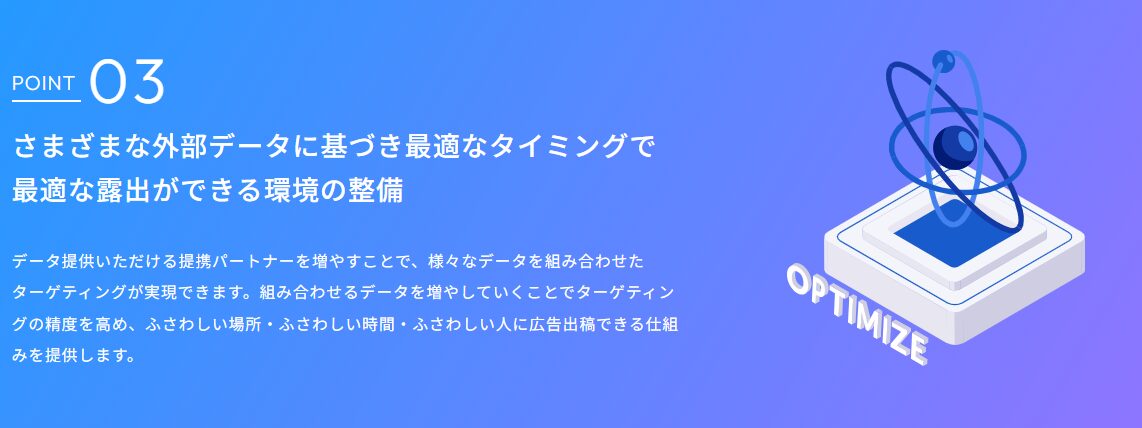媒体社、または連携するデータベースが保持する行動データと組み合わせることで、広告を表示する対象をターゲティングしたり、時間帯に応じた柔軟な配信が可能です。