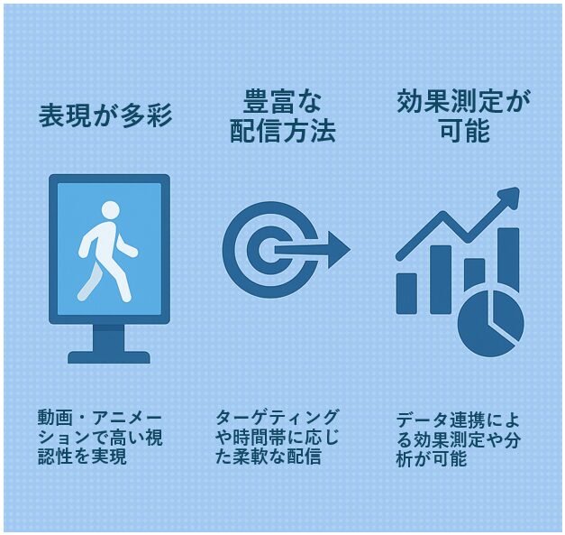 動画やアニメーションが使用でき、掲載面の形状や大きさにもバリエーションがあるため、視認性やインパクトの面で優れています。