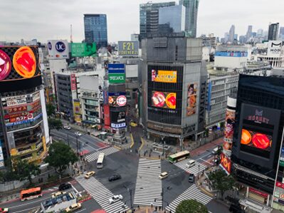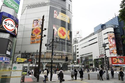 渋谷のスクランブル交差点にある複数の巨大ビジョン(Q’s Eye、109フォーラムビジョンなど)