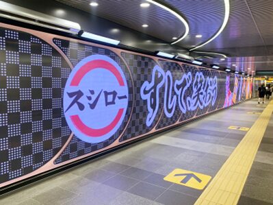 渋谷駅構内の各種のデジタルサイネージとスクランブル交差点のサイネージをジャックし、動画表現を中心に「すしで、笑おう」のメッセージとビジュアルを発信しました。