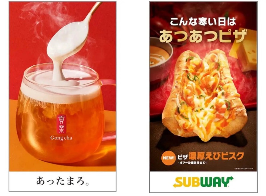 カフェチェーンの株式会社ゴンチャ ジャパンとサンドイッチチェーンの日本サブウェイ合同会社は、西新宿に設置されたサイネージで、その日の天気情報に合わせてコンテンツを自動で切り替え配信する広告を実施しました。具体的には、寒い日には熱々のメニュー、暖かさが感じられる日には冷たい/フレッシュなメニューを表示する広告です。