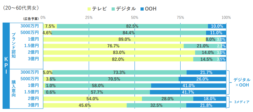 また、2025年の調査では、「購入意向」をKPIとした場合、広告予算が3000万~5000万円の場合は20%程度、1億円~1.5億円の場合は40%程度、2~3億円の場合は20%程度、交通広告を組み合わせて実施することで、KPIが最大化するという結果になりました。