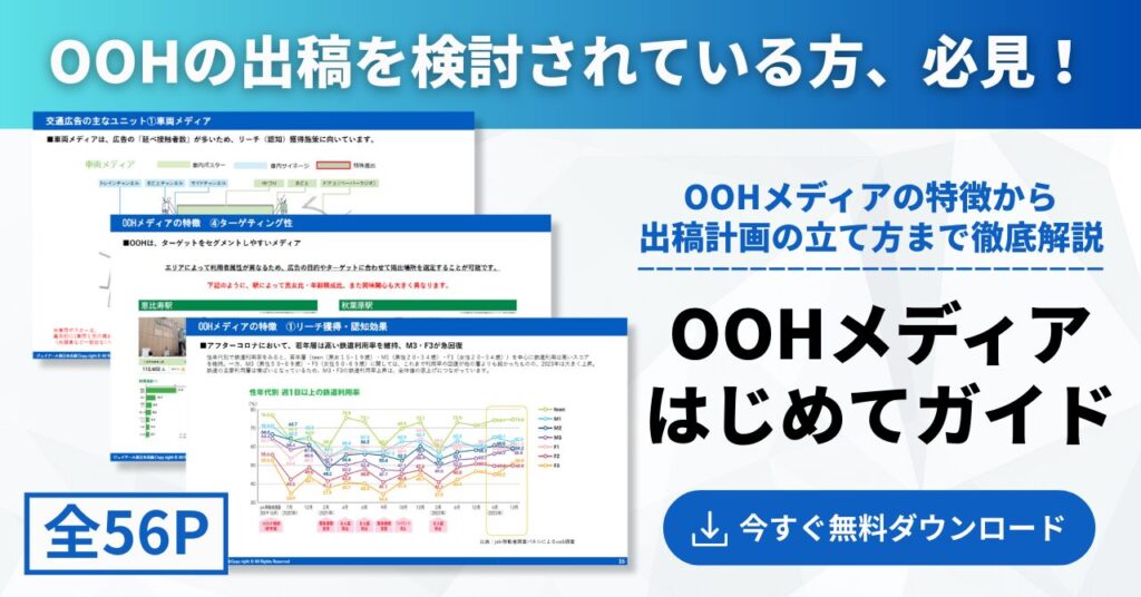 「効果が見えるOOH」で効果を測定すれば、Web広告などを併用したクロスメディア展開も、同一指標で評価し改善につなげることが可能です。交通広告・OOHメディアに限らず、広告は出して終わりではありません。きちんと数値で評価し、次の成功事例をめざしましょう。