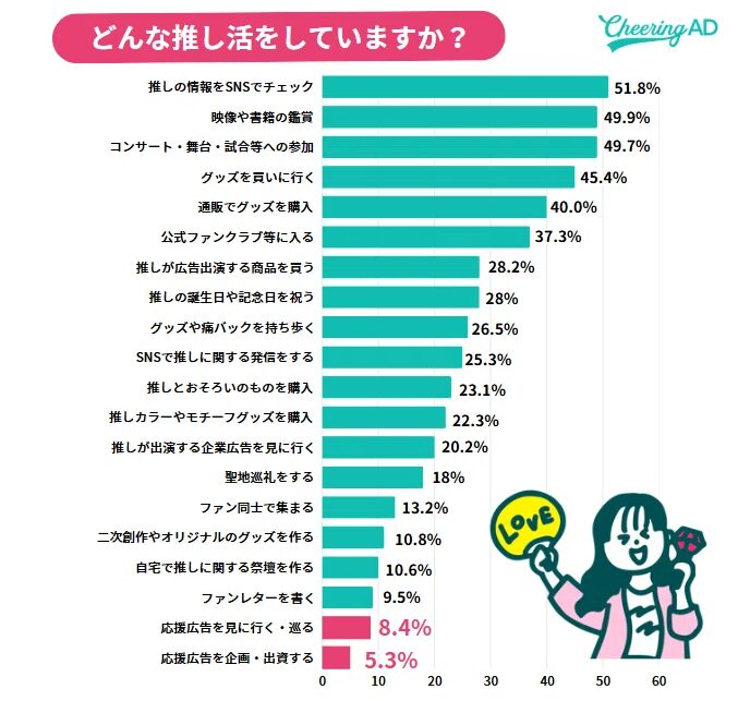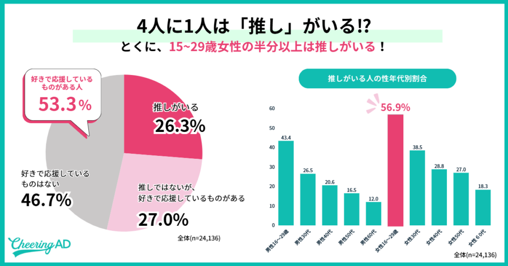 当社、ジェイアール東日本企画のCheering ADが行った調査では15~29歳のZ世代女性は半数以上(56.9%)が推しがいると回答しています。