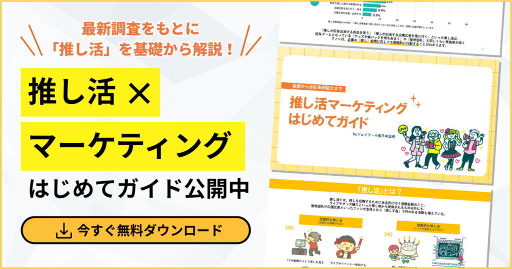 また、上記のような”推し活を行うファン”を巻き込んだ広告手法「推し活マーケティング」について、わかりやすいガイドブックを公開中です。興味がある方は、以下からダウンロードしてご活用ください。
