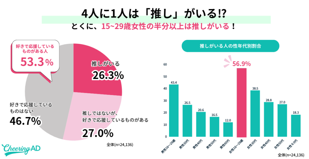 弊社の調査によると、「好きで応援しているものがある」と回答した人は全体の53.3%、そのうち「推し」と呼べるほど熱量高く応援している対象がある人は26.3%(約4人に1人)にのぼります。特に15〜29歳の女性では半数以上が推しを持つことが明らかになっており、推し活マーケティングは若年層を中心に高い効果が見込める施策です。