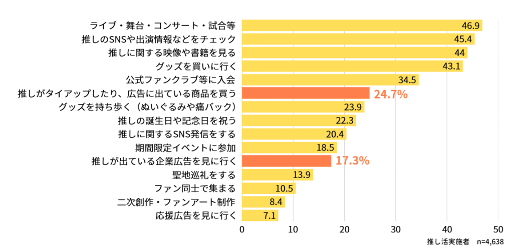 推しがコラボしている商品を購入したり、推しが出演する企業広告を見たりすることもメジャーな推し活です。推し活を行う熱量の高いファンが多いアイドルやアニメなどのコンテンツとコラボすることで、認知向上や売上向上につながります。