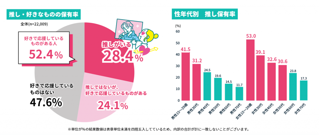 さらに、Z世代女性(15~29歳)では53.0%と半数以上が「推し」がいると回答しています。推し活ブームの広がりにより、若い世代にとって「推しがいること」は特別なことではなく、自分のアイデンティティやステータスの一部として定着しています。
