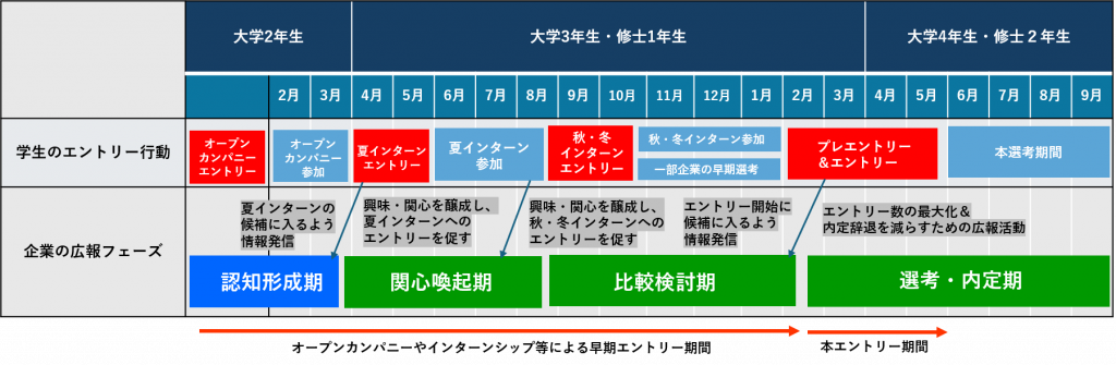 上記スケジュールの通り、できるだけ早期に潜在候補者を集め接触・囲い込みたい企業にとって、インターンシップ等によるエントリー数獲得は、採用活動解禁前の最重点施策となっています。