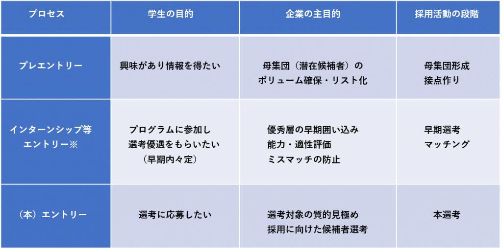 本来的な意味合いの「(本)エントリー」は、政府が要請している大学3年の3月以降となりますが、多くの企業は「プレ(準備)エントリー」や「インターンシップ等のエントリー」と称して、採用活動解禁前に優秀な学生の早期囲い込みや選考を始めています。