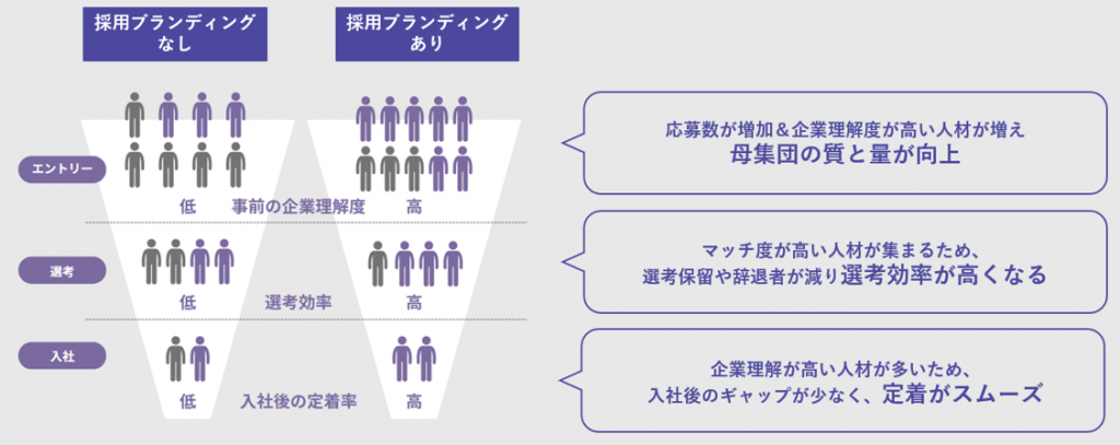 採用ブランディングに取り組むことで、ターゲット人材の企業認知を上げ、自社に対し、理解・共感・好意を持ってもらい、採用確度を高めることができます。エントリー数を増やし、その時点で自社を理解してくれる人を増やし、さらにその理解の結果、内定辞退者を発生しにくくする、という戦略です。