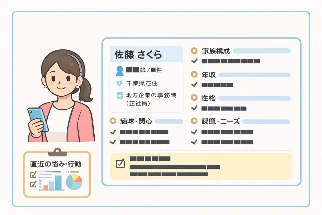 マーケティングにおける「ペルソナ」とは、詳細に設定した架空の求職者人材のプロフィールのことです。年齢や性別、居住地、年収、家族構成といった個人の状況を示す一般的な情報だけではなく、価値観や性格、習慣やライフスタイルなど、生活にまつわる細かな情報の集積で構成されます。「その人材が本当のところはどんな人間なのか」までリアルにイメージできるような架空のプロフィールが「ペルソナ」です。