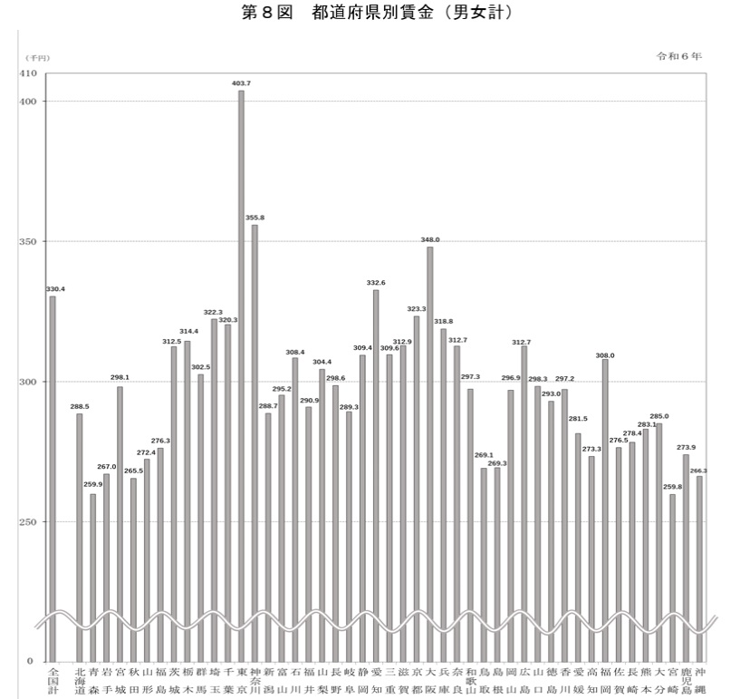 厚生労働省の「賃金構造基本統計(令和6年)」では、都道府県別の平均賃金に明確な差があり、東京都が最も高水準、多くの地方・県は月収30万円を下回る層が相当数を占める構図が示されます(男女計平均、各区分)。