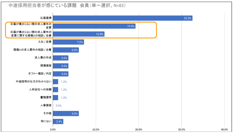 採用環境が激変している昨今、多くの中途採用担当者が、応募が集まらない際の求人要件の変更やそれに伴う現場との相談/合意について課題を感じています。