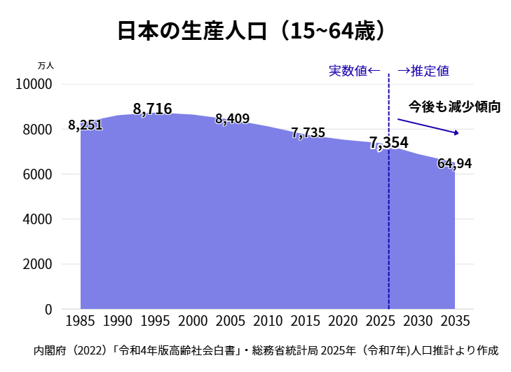 日本は少子高齢化が進み、生産年齢人口(15~64歳)は今後も減少し続けると予測されています。実際に1995年に約8,700万人だった生産年齢人口は、2025年2月時点では7,354万人へと減少しています。