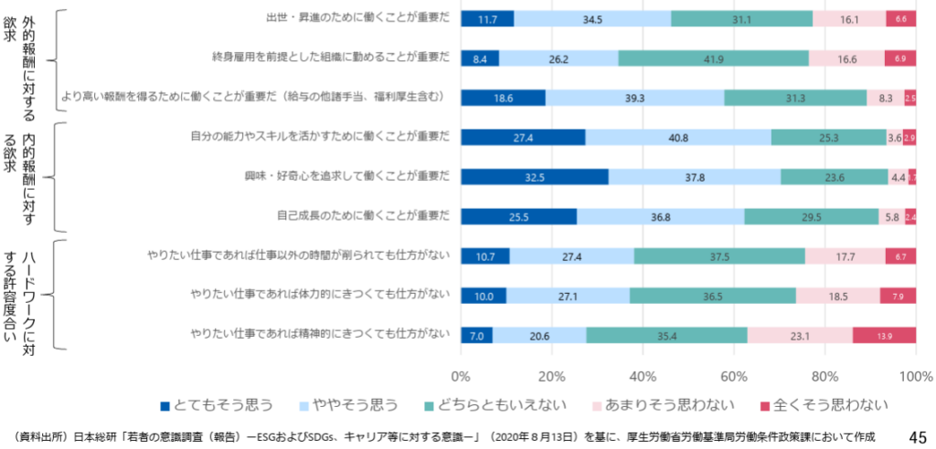 ➡外的報酬(出世や昇進・給与など)よりも内的報酬(自己成長)に対する欲求のほうが高い傾向