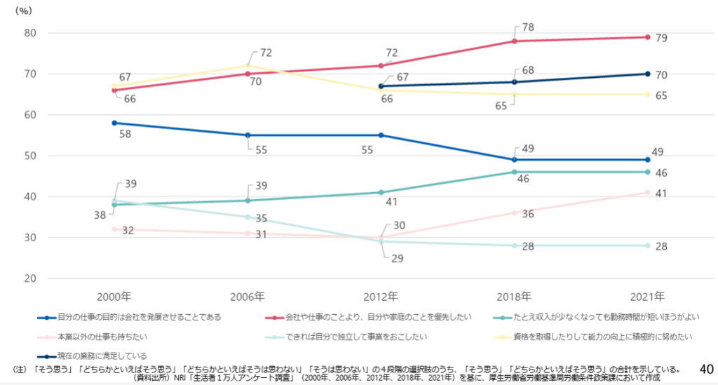 ➡「会社や仕事のことより、自分や家庭を優先したい」は、2000年と2021年を比較すると10%以上の上昇。