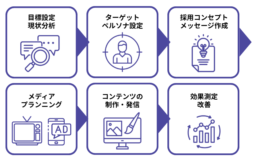 採用ブランディングはただ闇雲に自社の宣伝をすればいいというわけではありません。採用ブランディングの進め方を以下の6つのステップに分けて簡単に解説します。