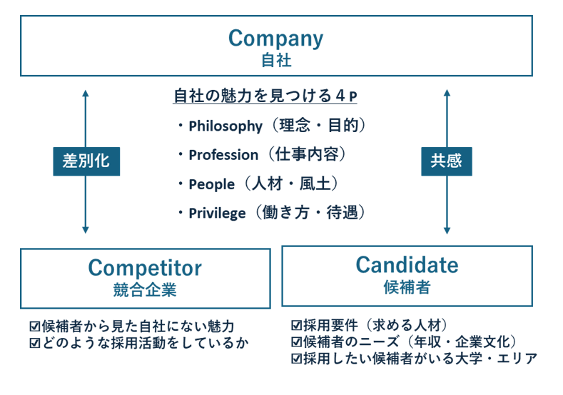 次に現状の分析として、自社の魅力や競合企業、求める人材の3Cを分析しましょう。