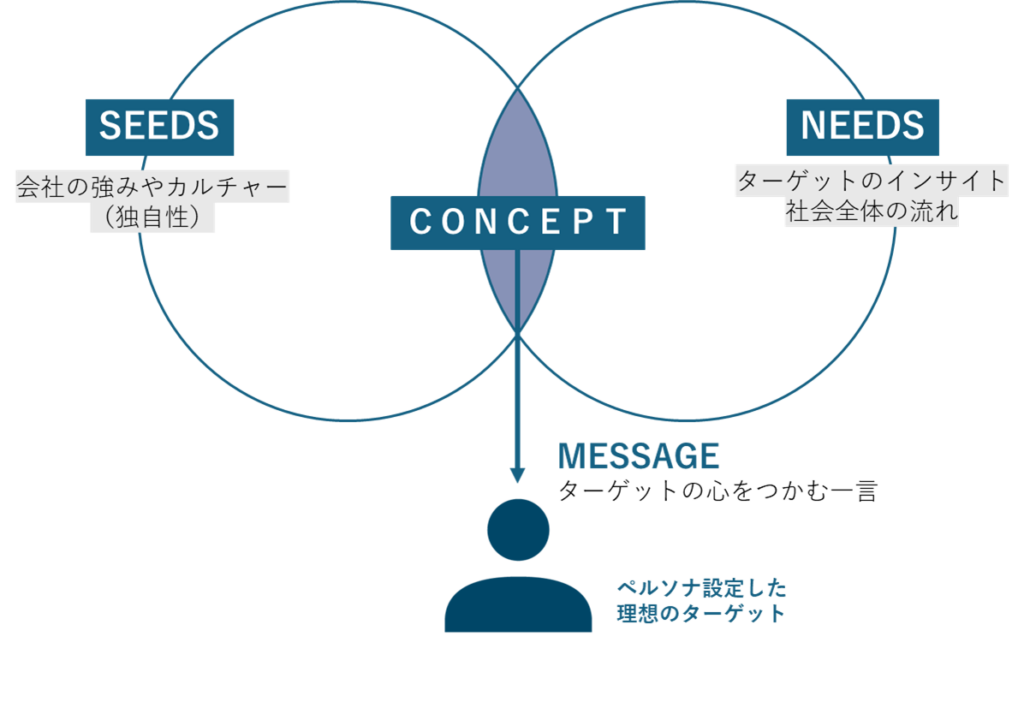 分析から導き出した自社の魅力や独自性の中から、設定したペルソナのニーズに合致する「採用コンセプト」を定め、短く・わかりやすく・心に残る「採用メッセージ」を作成しましょう。