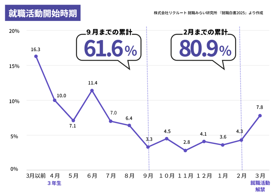 つまり、学生が企業を「知る」きっかけの主戦場は、3月ではなく、前年の夏から秋ごろ に移っているといえます。同じ株式会社リクルートの調査では、大学3年生の9月までに就職活動を開始している学生は 61.6% と過半数を超えています。