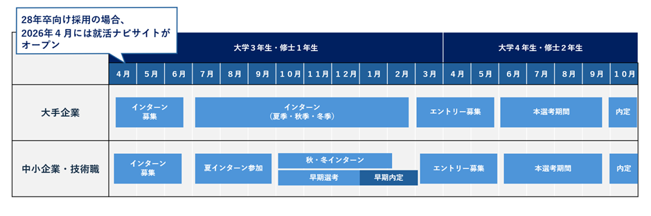近年、新卒採用のスケジュールは早期化しています。3月の「就職活動解禁日」に合わせて動き出しても、すでに学生の関心は競合他社へ――というケースも少なくありません。