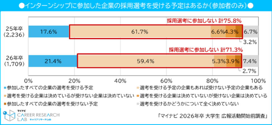 さらに、インターンシップに参加した企業について「採用選考に参加しない」と回答した学生は7割を超えており、インターンシップの参加学生が多かったからといって、そのままエントリー数が増えるわけではありません。