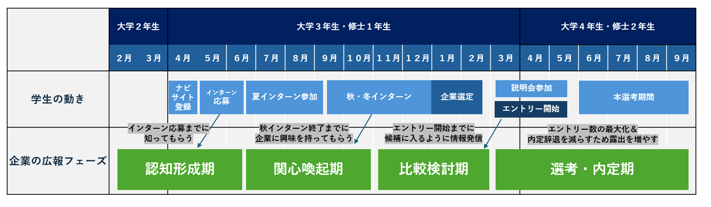 効果的な採用広報を行うためには、学生の行動や心理の変化に合わせて、最適なタイミングで情報を発信することが重要です。