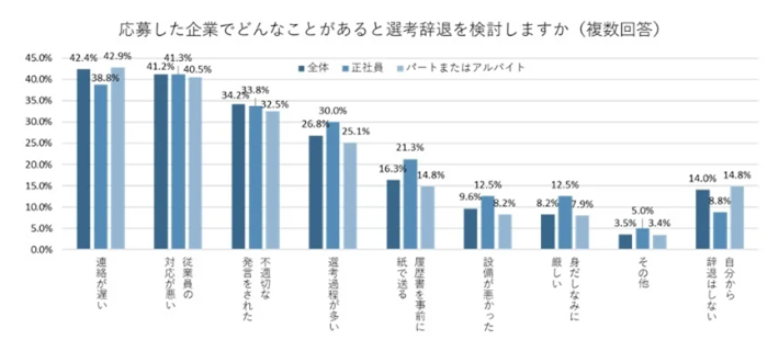 選考プロセス全体の体験設計は、採用ブランディングの中核です。レスポンスの遅れや曖昧な連絡対応は「この企業は対応が遅い」「誠実さに欠ける」といった印象を与えるリスクがあります。