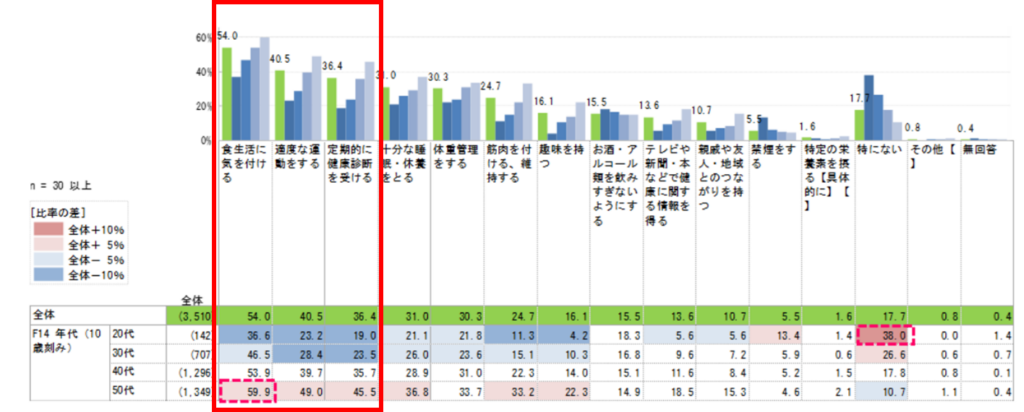 日本生活協同組合連合会が実施した「老後」への意識調査によると、健康のために現在気を付けていることという質問に対して「食生活に気を付ける」「適度な運動をする」「定期的に健康診断を受ける」などの項目で50代は他の年代よりも高い結果を示しました。