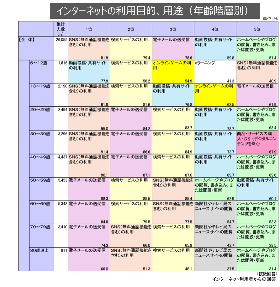 以下のグラフは年代別のインターネット利用目的を示しています。60歳以上の主な利用目的トップ3は、「電子メールの送受信」「ソーシャルネットワーキングサービス(SNS)の利用」「情報検索」です。「SNSの利用」は60代では79.5%、70代では65.9%で、若年層と比較するとやや低いものの、インターネットを利用するシニアのほとんどがSNSを活用していることがわかります。