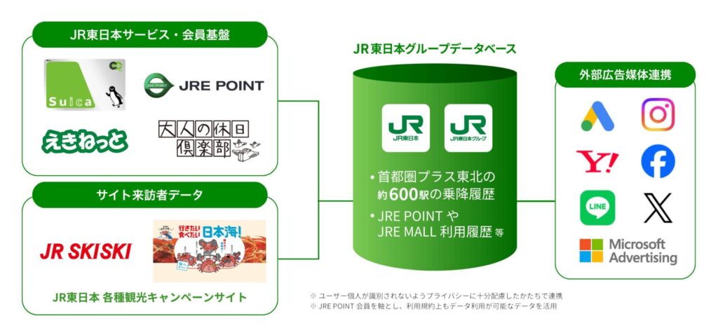 この広告では、JR東日本の移動・購買データをもとにターゲティングが可能です。例えば、以下のようなデータを活用します。