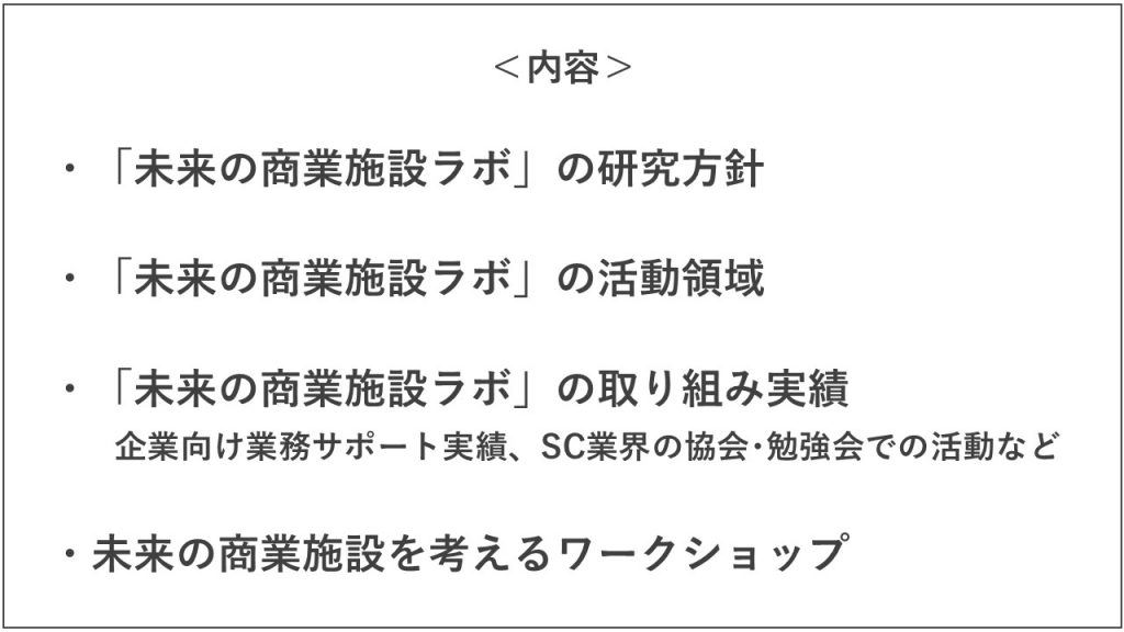 「未来の商業施設ラボ」の研究方針、活動領域、取り組み実績(企業向け業務サポート実績、SC業界の協会・勉強会での活動)、未来の商業施設を考えるワークショップなどをご紹介しております。